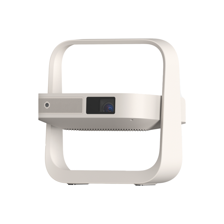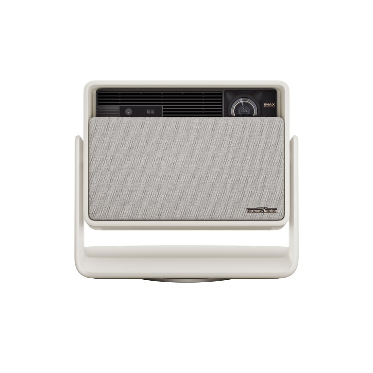 The Horizon line is XGIMI’s flagship home projector, available in five different versions with varying capabilities. The latest designs—the S Pro and S Max—are properly stylish, with curved bodies, a pearlescent cream finish, and automatic sliding lens covers made from soft wool fabric. (More design chops: the brand once collaborated with Yves Saint Laurent on a leather-wrapped version of the Horizon.) Both the Pro and the Max, which debuted last fall, can handle being at strange angles thanks to the flexible, built-in stand that increases positioning options. In our apartment, the Max sits on top of a tall Muji SUS shelf that also stores our dishes and glassware. Like I said, most guests think it’s just a nice smart speaker until we wake it up.